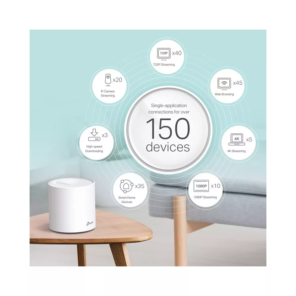 Les routeurs Wi-Fi 6 Mesh DECO X50 constituent la pointe de la technologie en matière de réseaux Wi-Fi pour les environnements domestiques ou professionnels. Face à l'augmentation des besoins en connectivité dans les maisons intelligentes, il est crucial de disposer d'une couverture Wi-Fi étendue, fiable et sécurisée, couvrant jusqu'à 250 m². Pour augmenter cette couverture, il suffit d'ajouter une unité supplémentaire de la série TP-Link DECO ou un autre pack DECO X50.