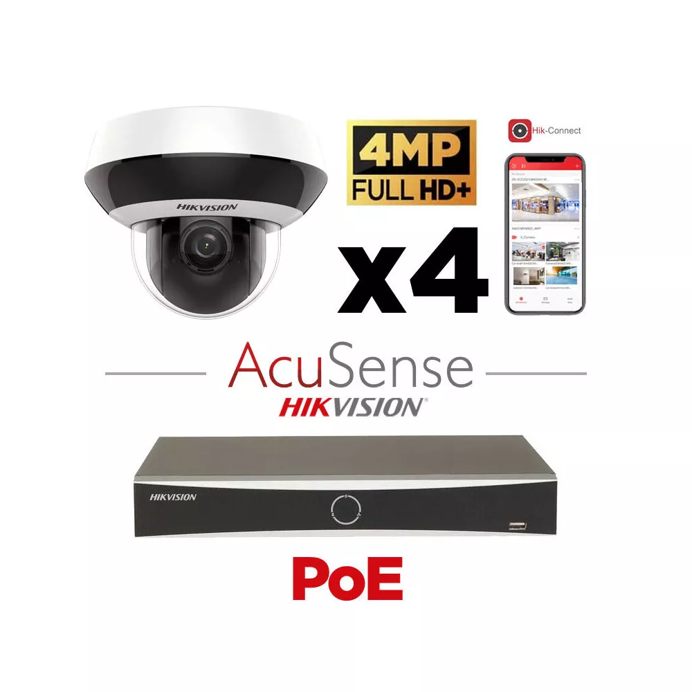 Ce kit est composé de 4 caméras de surveillance PTZ Hikvision avec un zoom optique x 4 et vision de nuit jusqu'à 20 mètres.
