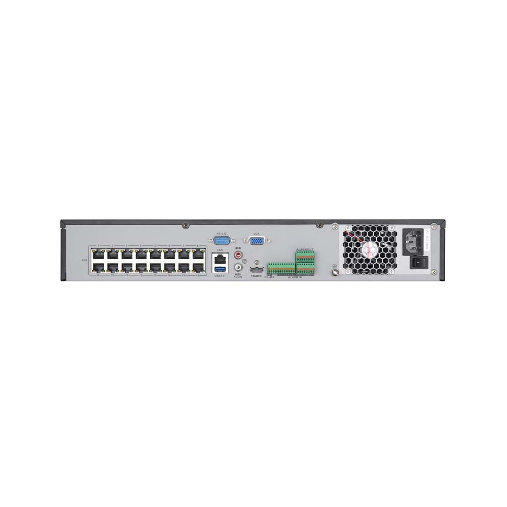 La bande passante entrante et sortante atteint 160 Mbps, ce qui permet de gérer simultanément 16 flux haute résolution sans perte de fluidité. La connexion réseau s'effectue via une interface RJ45 10/100/1000 Mbps auto-adaptative.