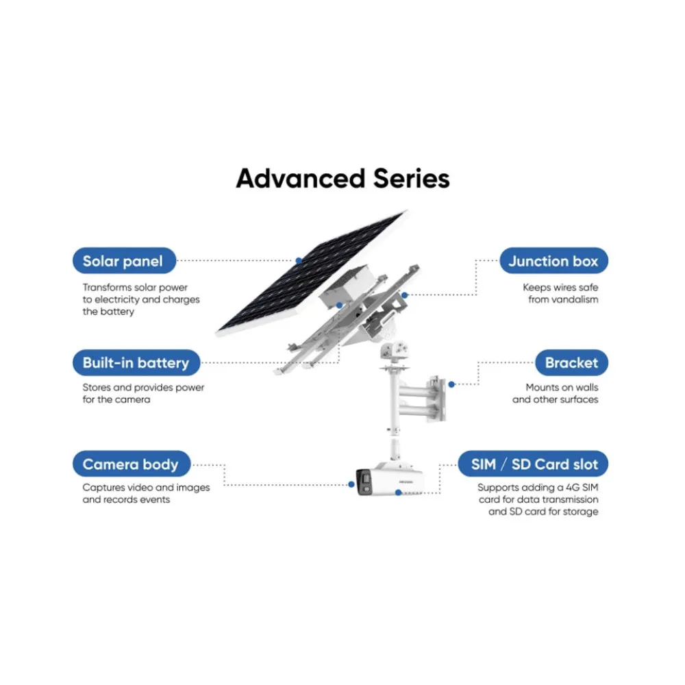 Le kit caméra autonome 4MP DS-2XS6A46G1/P-IZS/C36S80 est destiné à être installé dans des environnements privés de réseau internet et d'électricité. Grâce à son panneau solaire de 80 watts, il assure un fonctionnement autonome de 5 jours dans des conditions sans soleil lorsque la batterie est entièrement chargée.