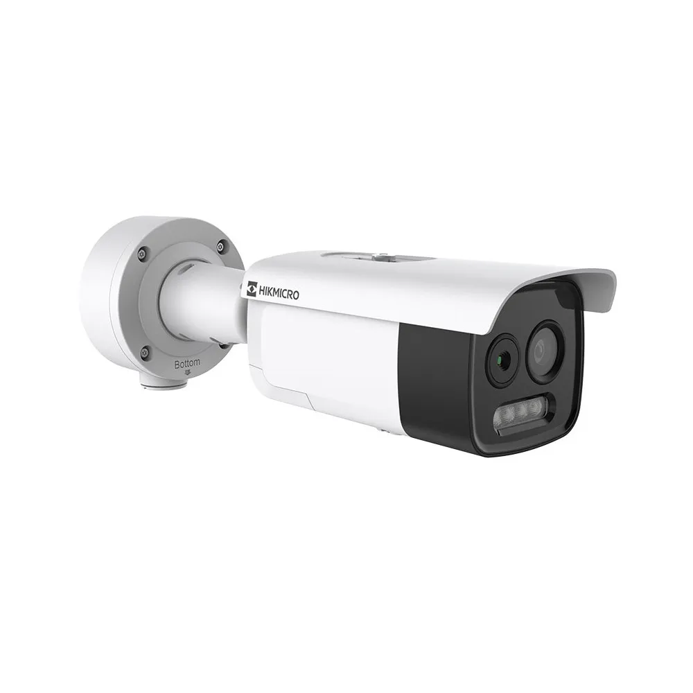 Cette caméra de surveillance thermique et optique bispectre d’Hikvision combine un module thermique 256 × 192 avec un module optique 5 MP pour la protection périmétrique et la détection de température sur un même boîtier bullet.