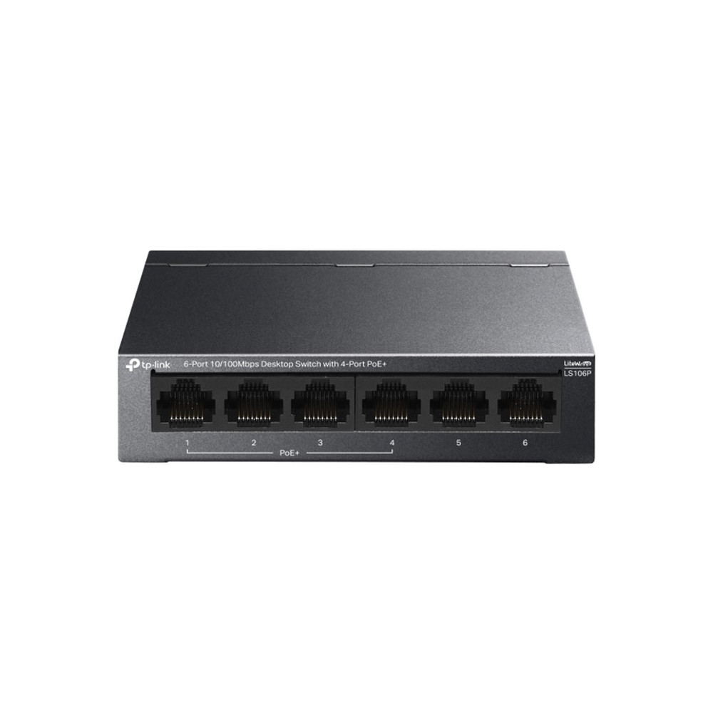 Le switch de bureau TP-LINK LS106P est un commutateur Fast Ethernet non administrable avec 6 ports RJ45 10/100 Mbps dont 4 ports PoE+ et un budget total de 65 W.