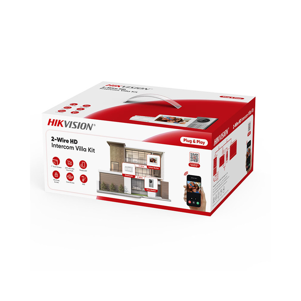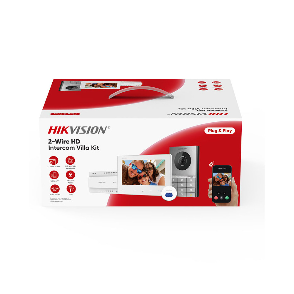Le kit visiophone 2 fils HD d'Hikvision DS-KIS706EY réunit une platine de rue 2 MP, un moniteur intérieur 7" à écran tactile et un distributeur vidéo/audio pour l’alimentation et la liaison sur bus 2 fils. Ce kit s’adresse aux installations de type maison ou villa avec un bouton d’appel unique et assure une communication audio et vidéo sur un câblage réduit.