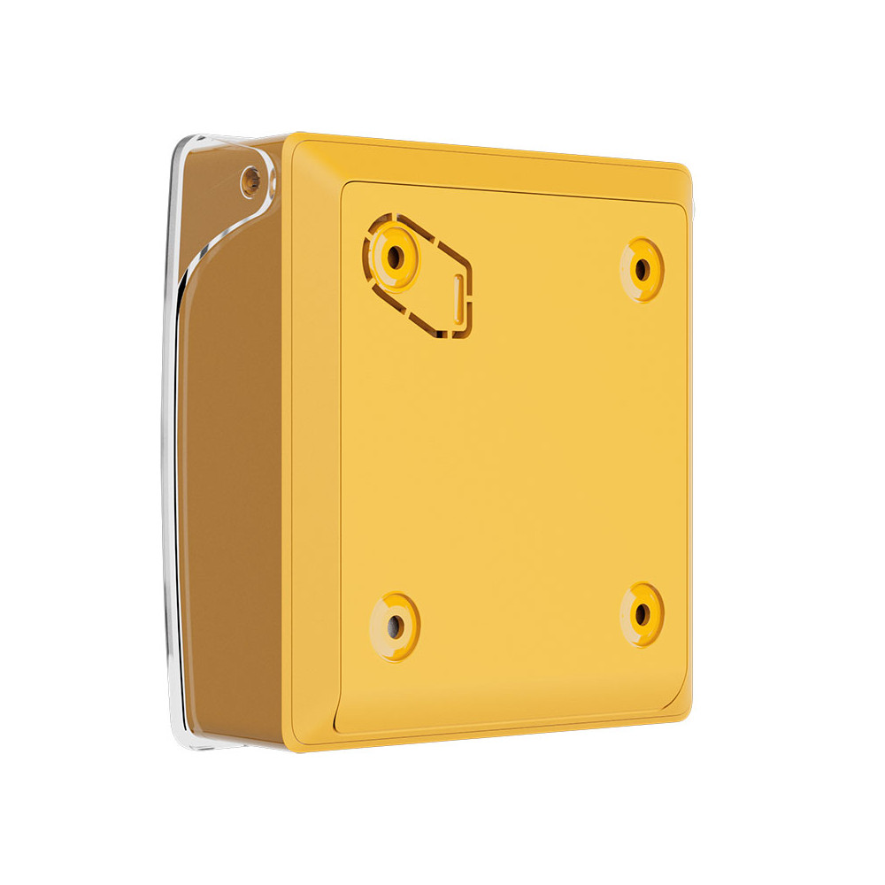 Une façade transparente protège la surface de pression pour limiter les déclenchements accidentels, tout en laissant visible la zone d’appui. Le verrouillage du boîtier sur la platine par un système de blocage mécanique sécurise l’installation en exploitation courante.