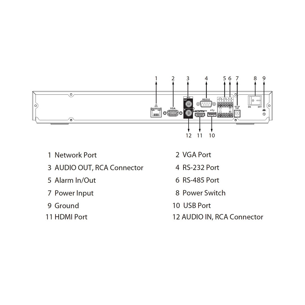 La sortie vidéo se fait via un port HDMI et un port VGA, avec la possibilité d’afficher des résolutions élevées. Le port HDMI peut aller jusqu’à 7680 × 4320 (8K), 3840 × 2160 (4K) ou des résolutions inférieures comme 1920 × 1080. Le port VGA gère des résolutions jusqu’à 1920 × 1080. L’enregistreur peut afficher des écrans multiples en 1, 4, 8, 9 ou 16 vues sur l’écran principal et le même choix de mosaïques sur l’écran secondaire.
