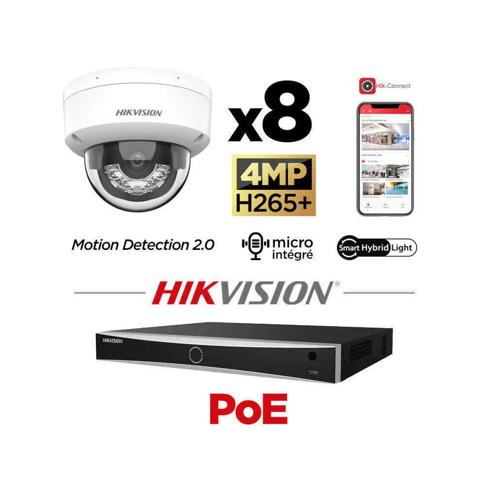 Ce kit vidéosurveillance avec caméras dôme antivandale avec Motion Detection 2.0 (intelligence artificielle) et Smart Hybrid Light (lumière hybride intelligente) intègre tous les éléments nécessaires à la mise en place d'une solution de vidéosurveillance.